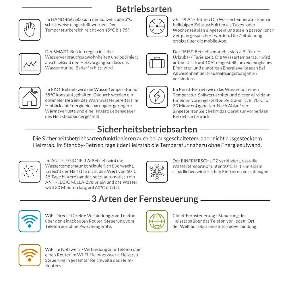 Dostupna su vam tri tipa daljinskog upravljanja: WiFi Direct omogućuje izravnu vezu između telefona i grijača, dok WiFi u mreži osigurava upravljanje putem kućnog rutera. Uređajem također možete upravljati s bilo kojeg mjesta na svijetu pomoću daljinskog upravljača u oblaku.