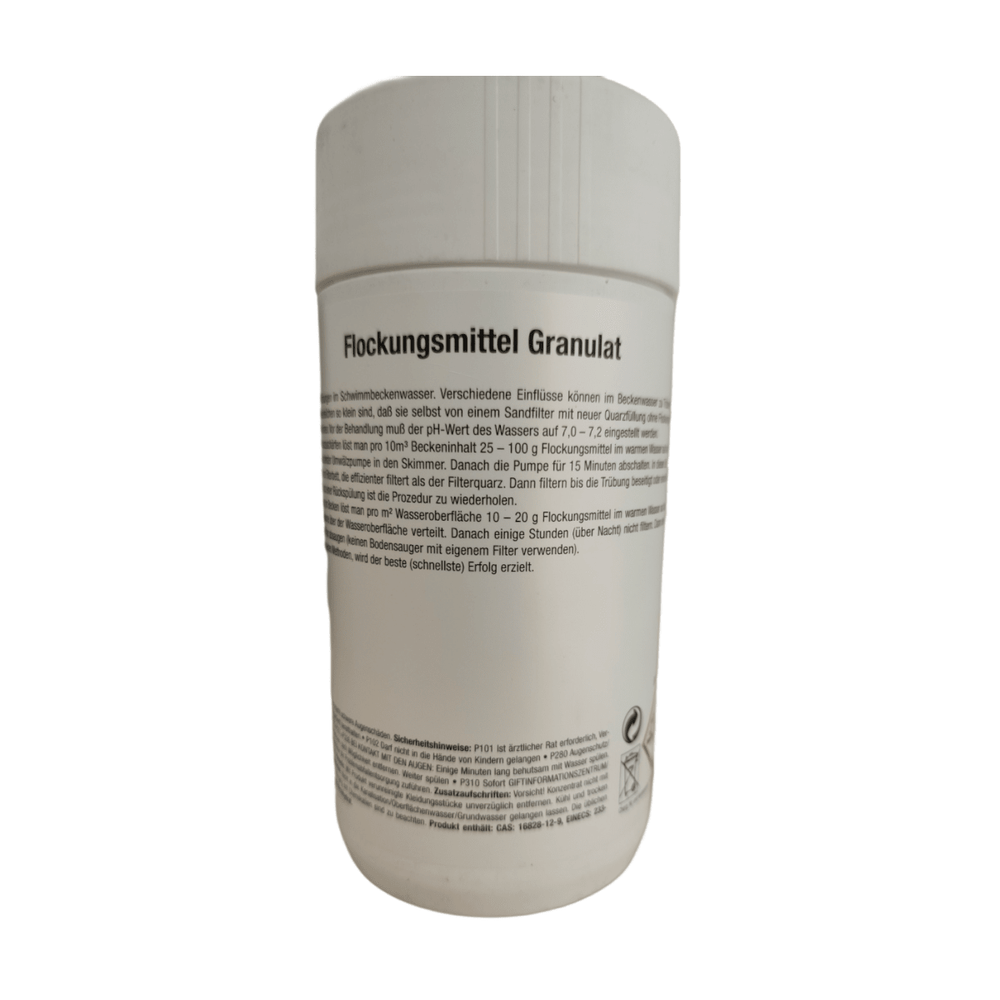 Za tretman, pomiješajte 40-80 ml flokulanta na 10 m³ vode u kanti. Zatim otopinu ravnomjerno nanesite po cijelom bazenu i dobro promiješajte. Za poticanje flokulacije, isključite sustav filtriranja preko noći kako bi se suspendirane čestice mogle slegnuti. Na kraju, uklonite suspendirane čestice usisavanjem i temeljito isperite filter.